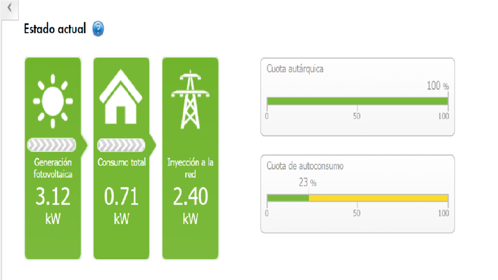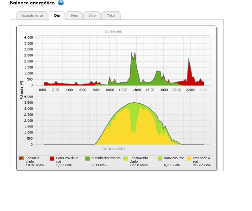 A continuación, se incluyen imágenes de la aplicación de monitorización que nuestro cliente podrá consultar desde un dispositivo móvil. Podemos ver la producción y los consumos del día, reflejados en una gráfica donde vemos a qué hora se producen. Con esta información podemos saber las horas que nuestra instalación produce más y, por tanto, aprovechar para realizar tareas que requieran de energía eléctrica como poner lavadoras, encender el horno, etc. Otra ventaja de esta monitorización es que podemos tener controlada nuestra instalación aunque estemos ausentes, solo necesitamos el teléfono y una conexión a internet.